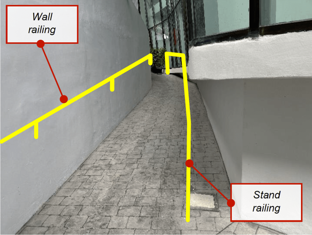 Placing railing on the wall and stand railing to prevent users from hitting wall edges