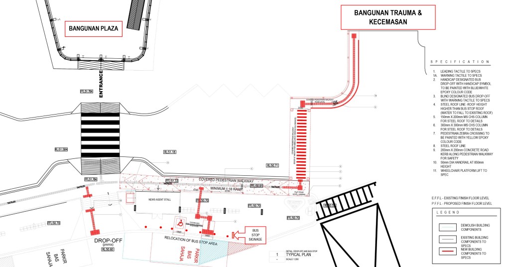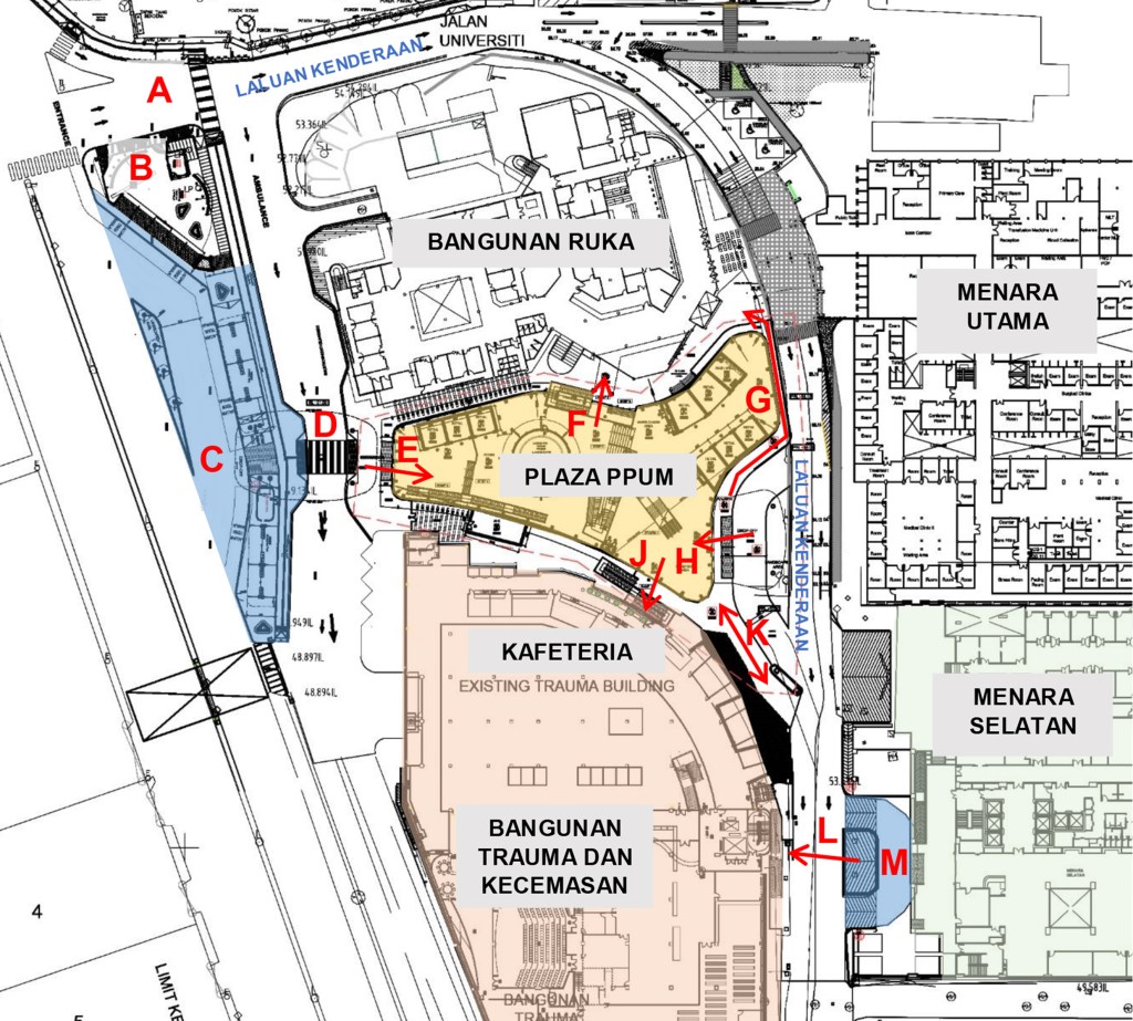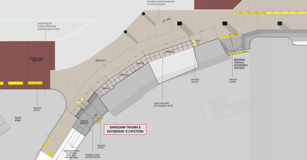 PPUM Plaza was built in 2020 to connect the existing buildings in Pusat Perubatan Universiti Malaysia (PPUM) with the aim to control crowd movement and the traffic in the area. As part of the initiative, access audit for universal design compliance is conducted to ensure a seamless connectivity that is friendly to all types of users with different abilities, especially Persons with Disabilities (PWD) and the elderly.