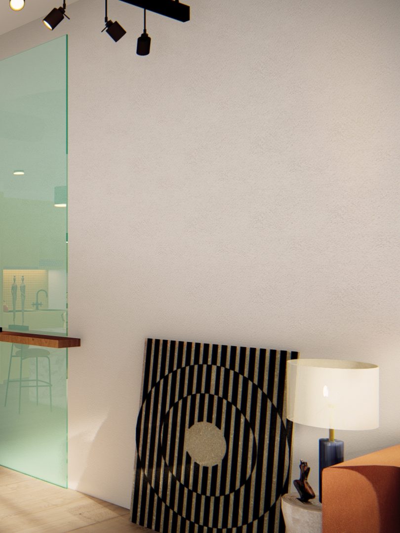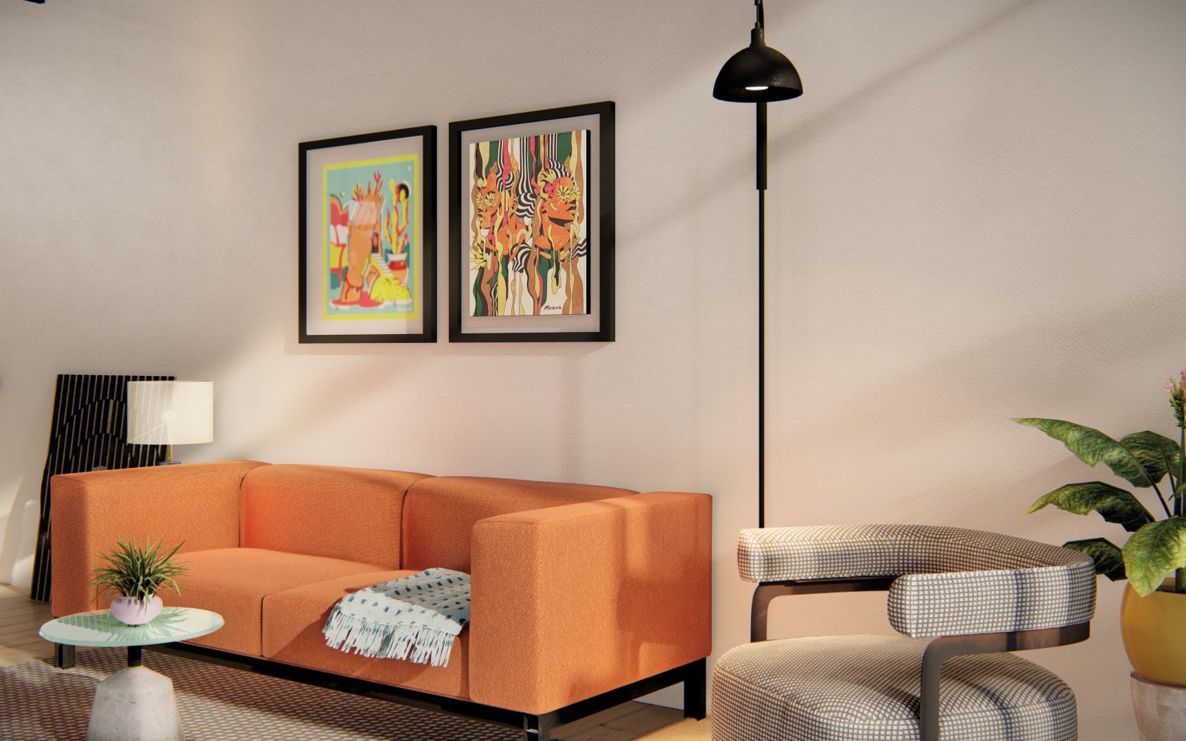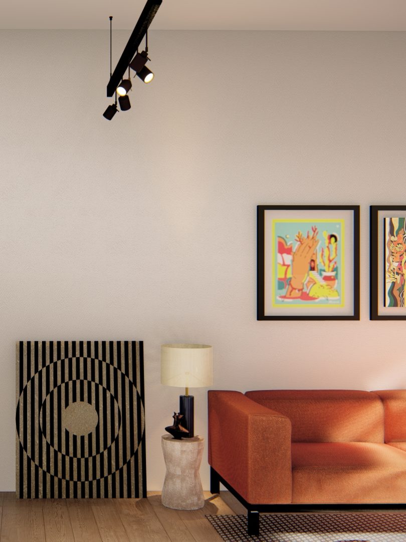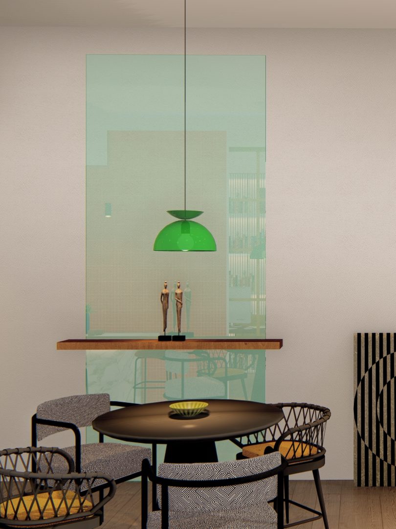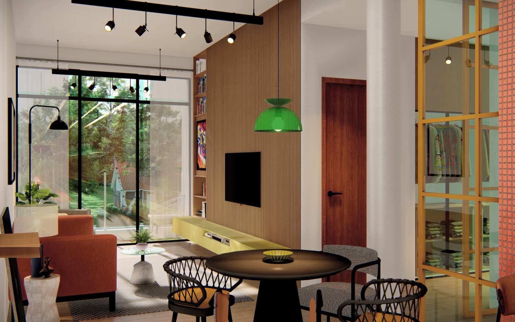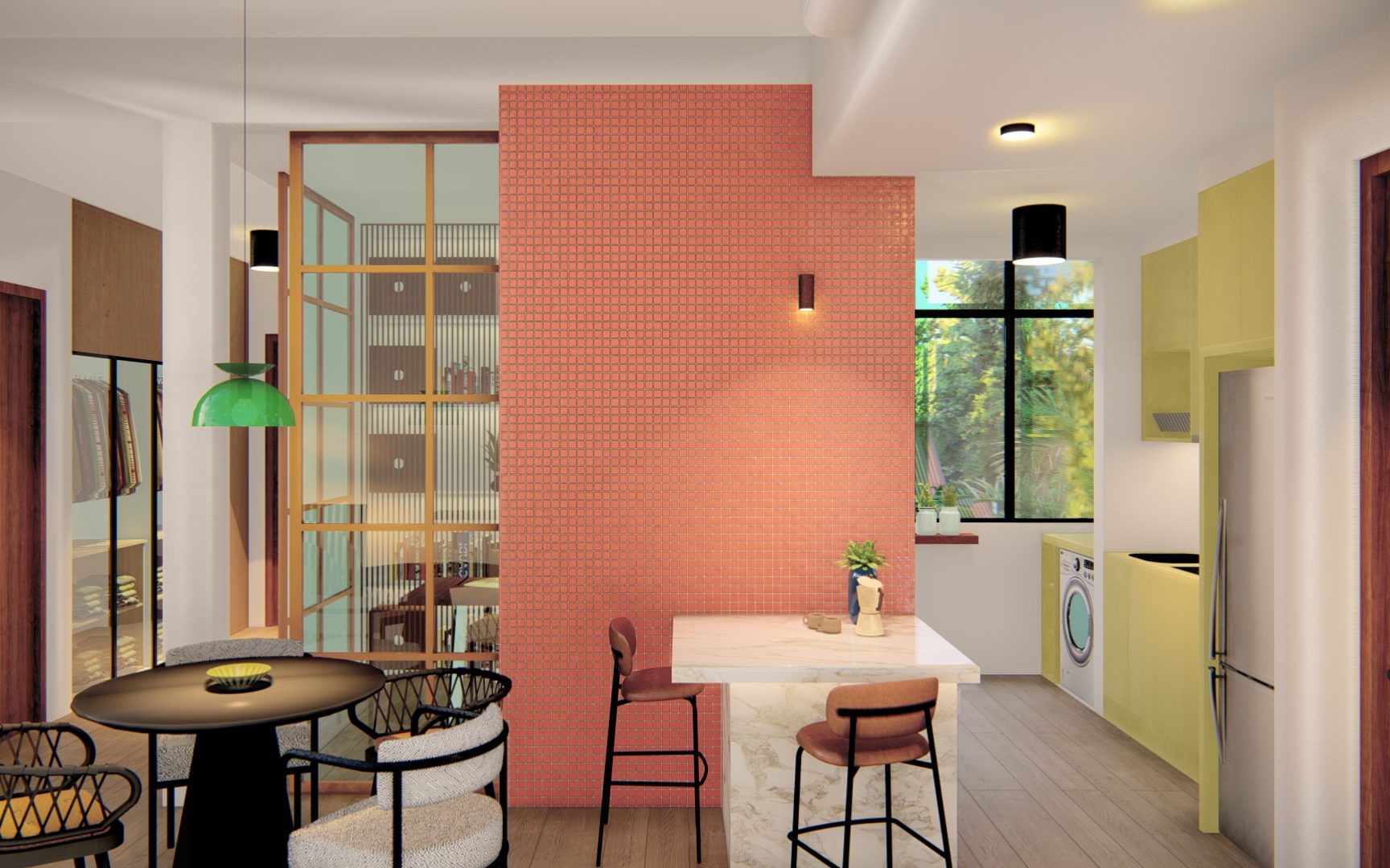 Embracing a modern lifestyle, this 950sqft apartment draws inspiration from eclectics style interior while incorporating neutral tones to balance the palette. The apartment features three bedrooms, with one bedroom converted into a home office partially separated with glass sliding doors to allow interactions between occupants.