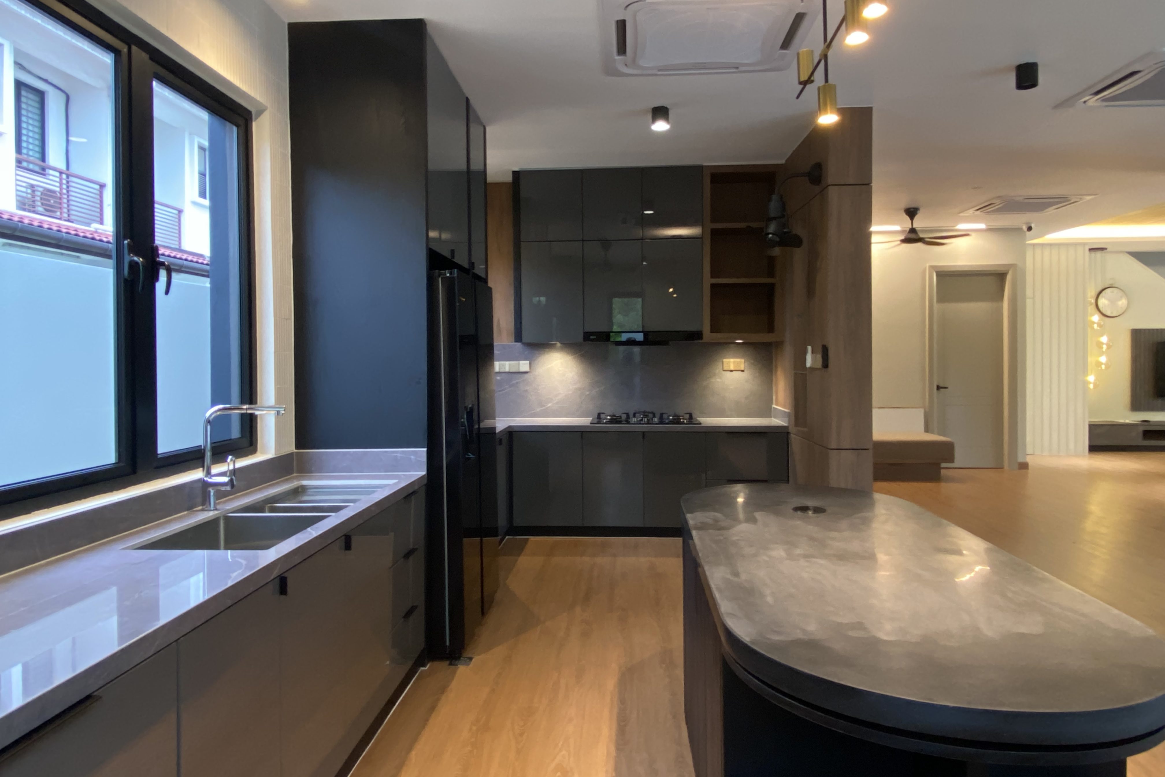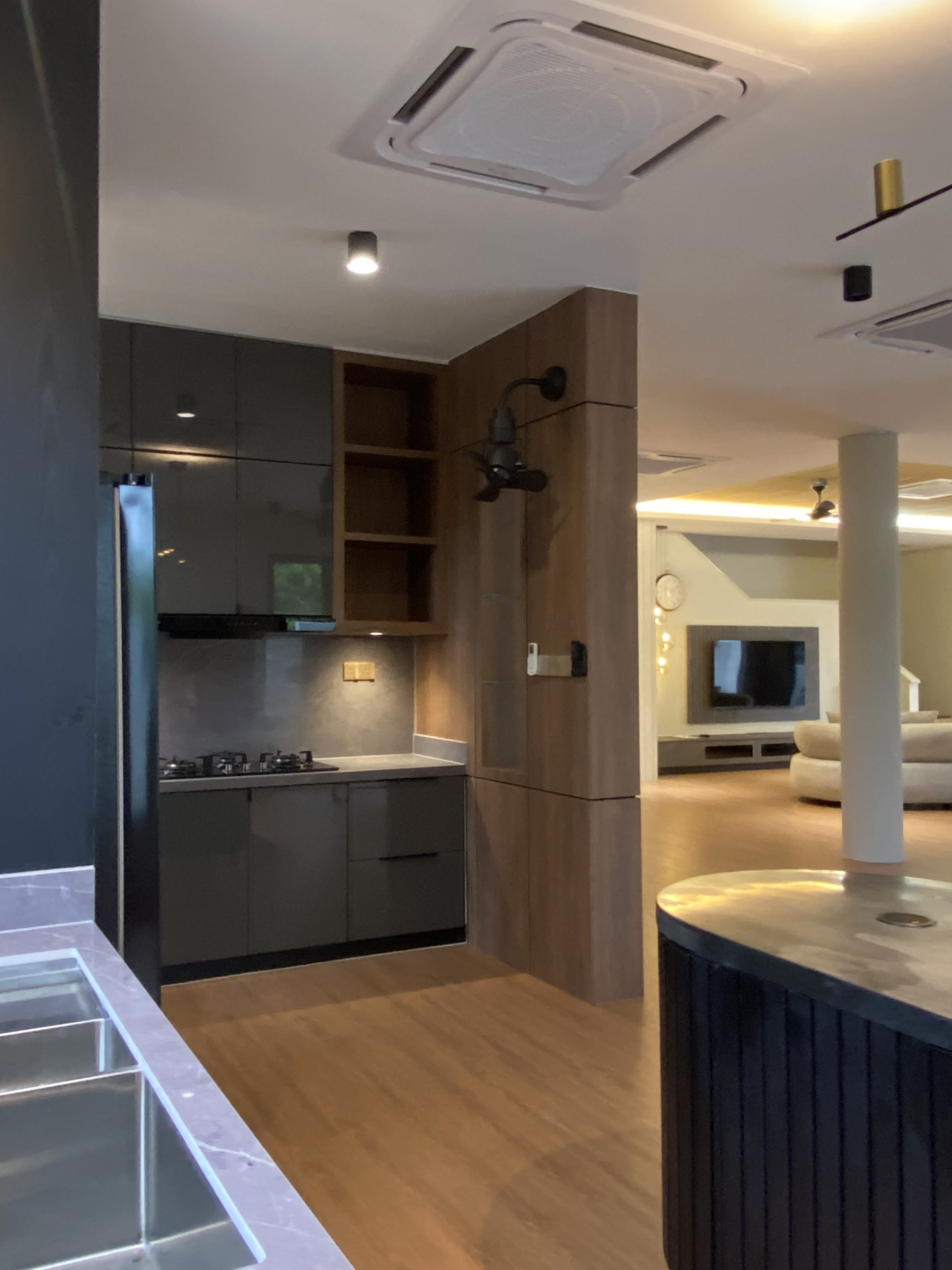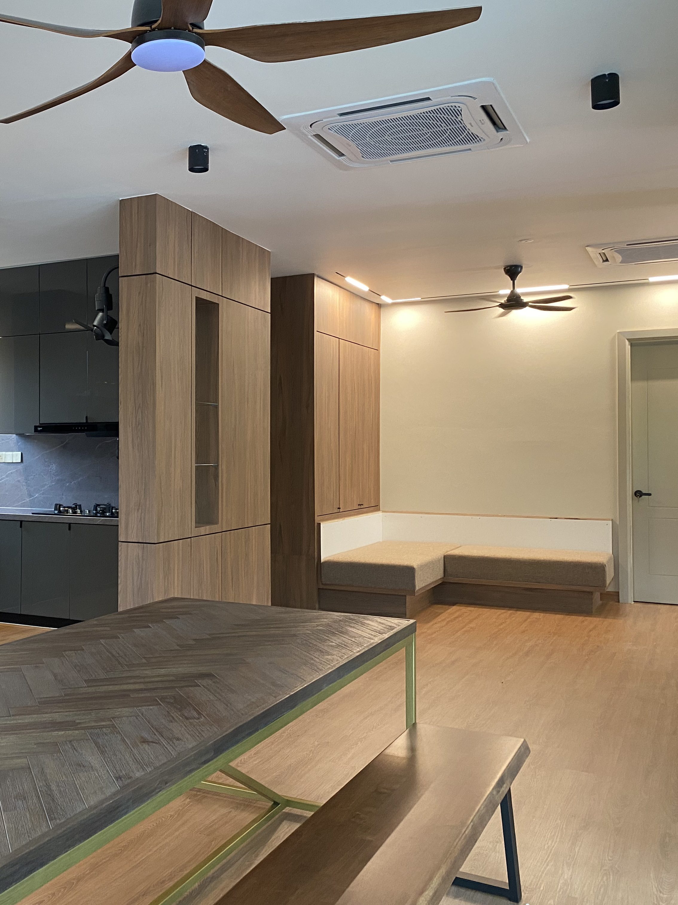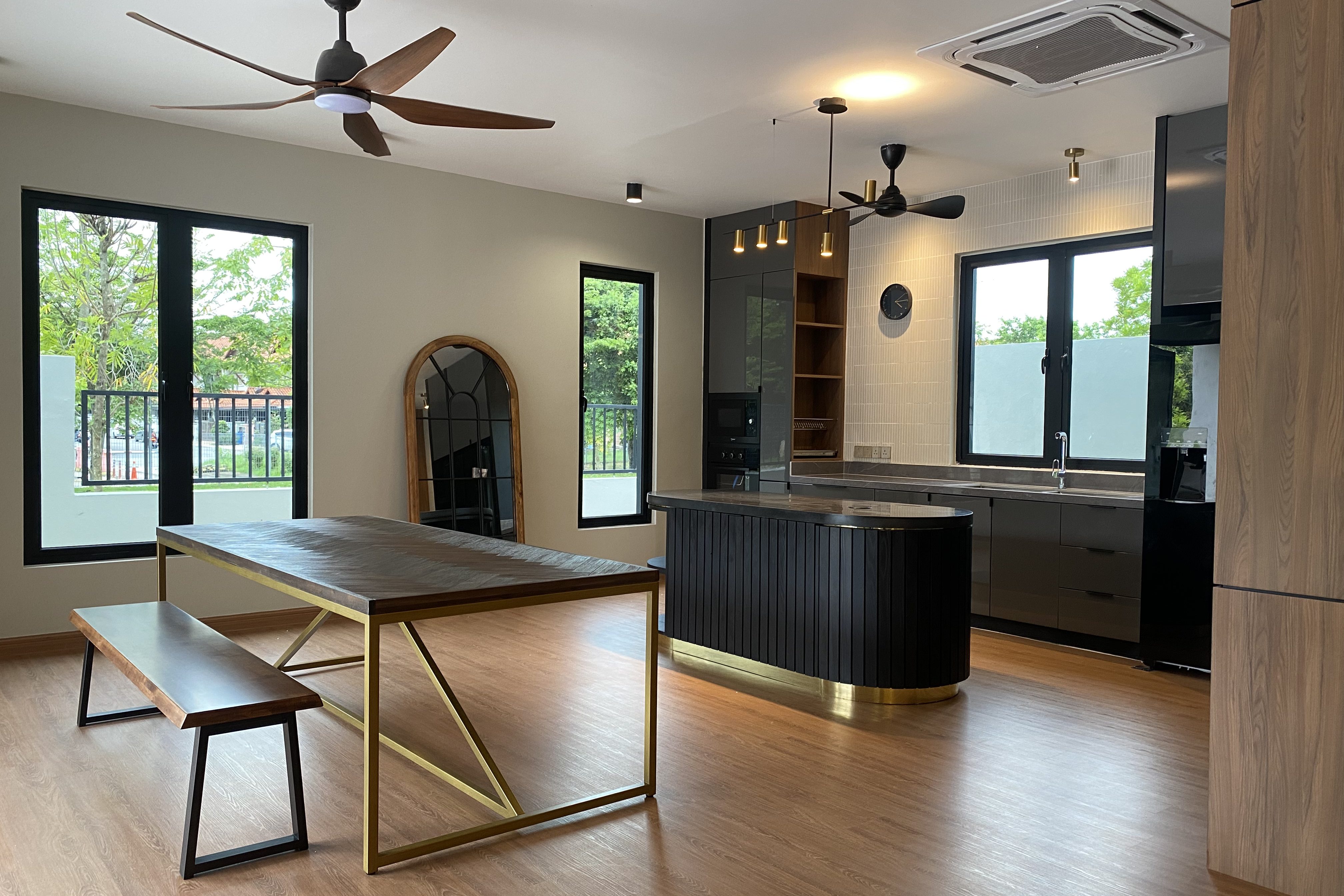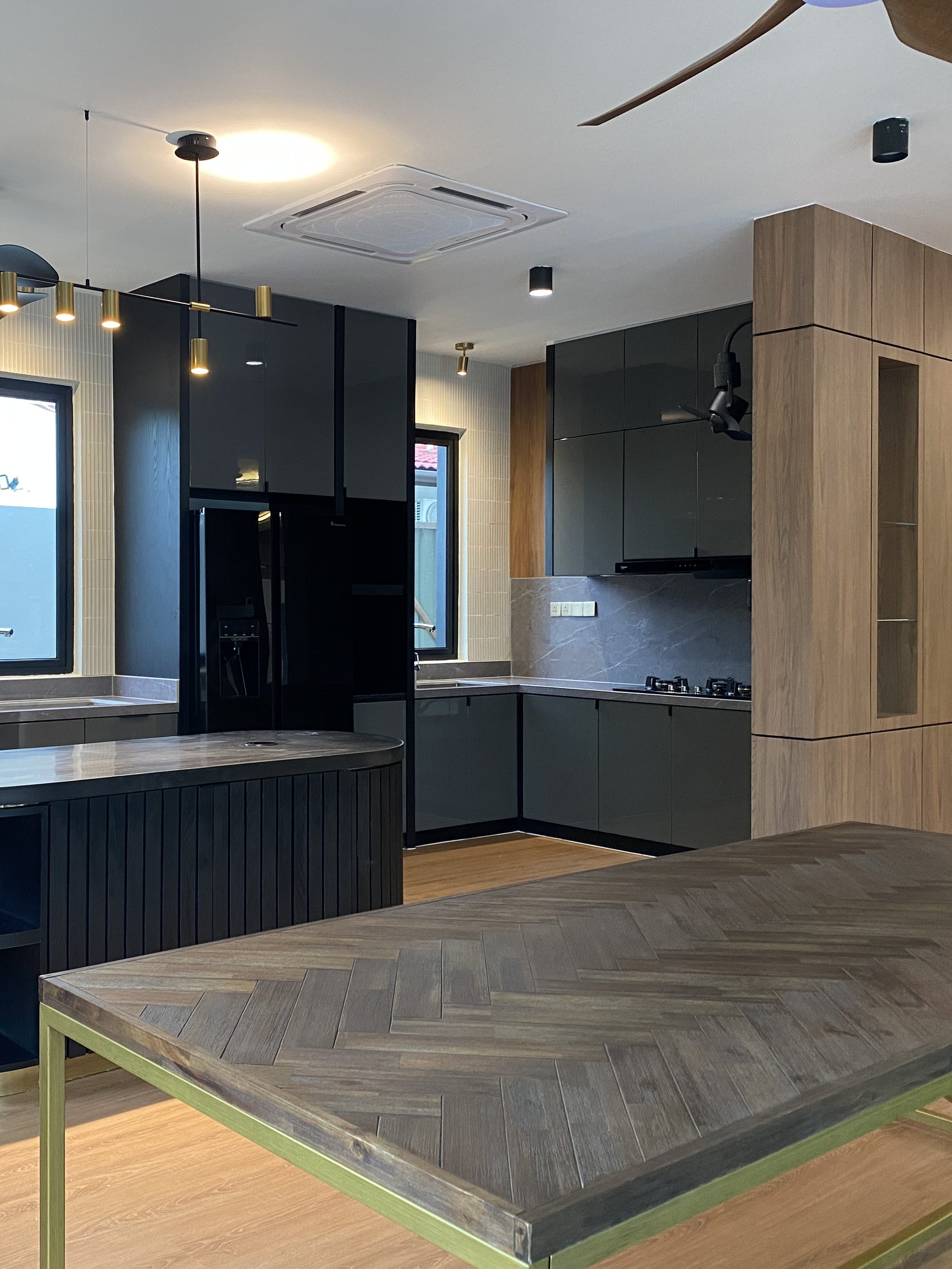 This project features a full-scale renovation and interior design project for a family home in Nukilan, Alam Impian. The ground floor section was redesigned with a warm and modern palette of timber tones, warm grey, and dark navy blue accents. Interior works include furnishing, full-height custom cabinetry, wet and dry kitchen installations, ceiling and lighting upgrades, bathroom fittings, tiling, electrical rewiring, and overall interior finishing. The layout design brings together function and practicality to maximise space, natural light, and seamless flow across the living hall and dining areas.