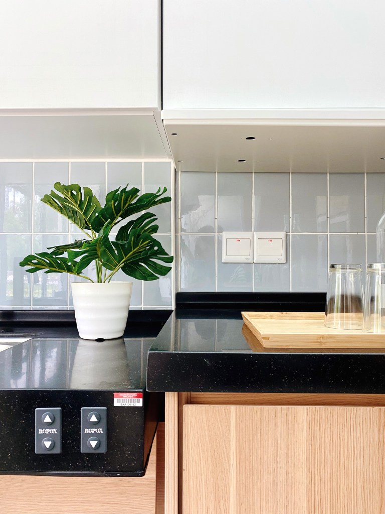 Upgraded kitchen features: pull-down dish rack, adjustable cabinet, adjustable sink counter, pull-out waste bin, pull-out table, and folding table.